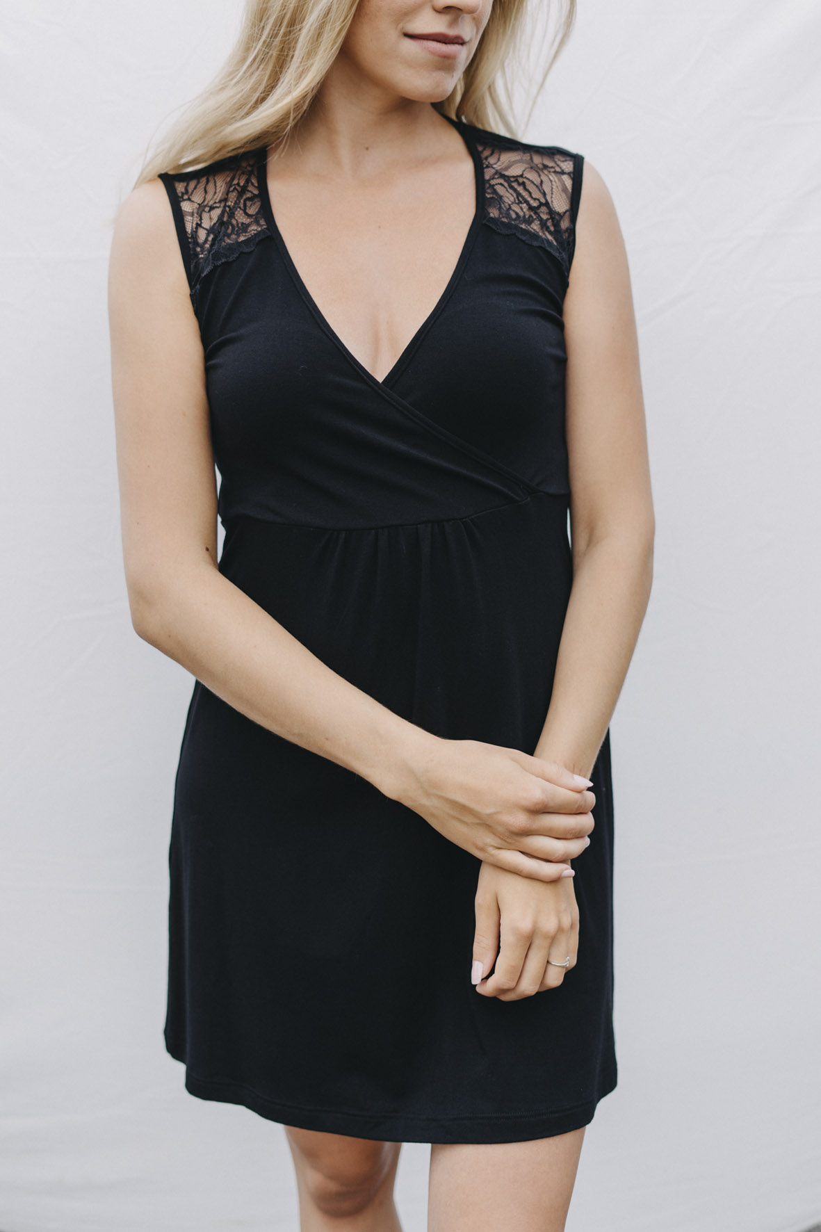 Noční košile MAMA s překříženým výstřihem je dlouhá těsně nad kolena. Elegantní černá barva je klasika, která se ve skříni neztratí. Košili zdobí krajka na ramenou. Ramínka jsou dostatečně široká, takže pyžamo drží kde má a neposouvá se, když se ve spánku převalujete.