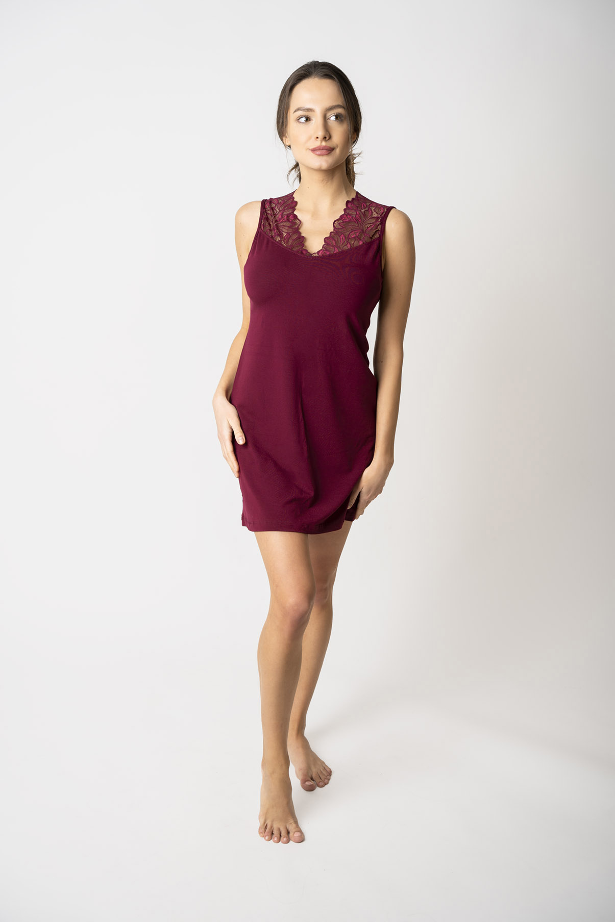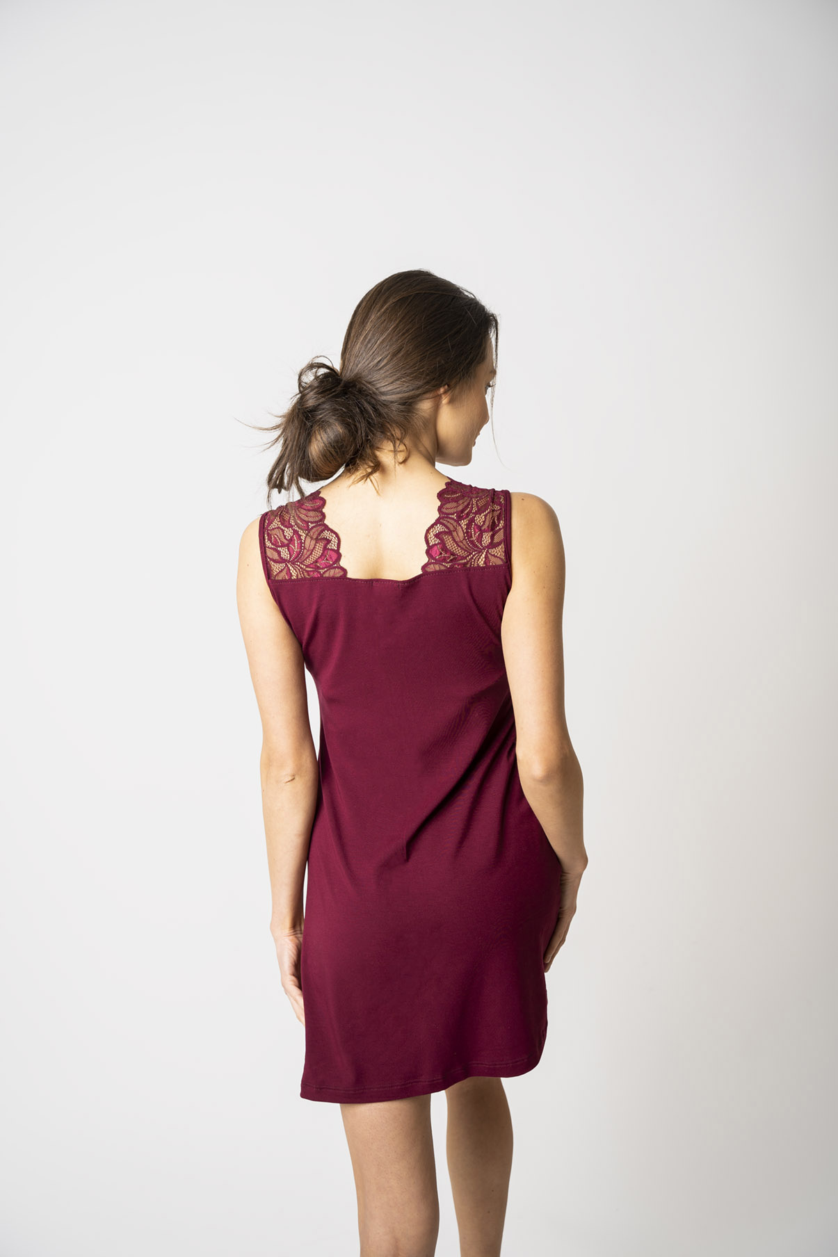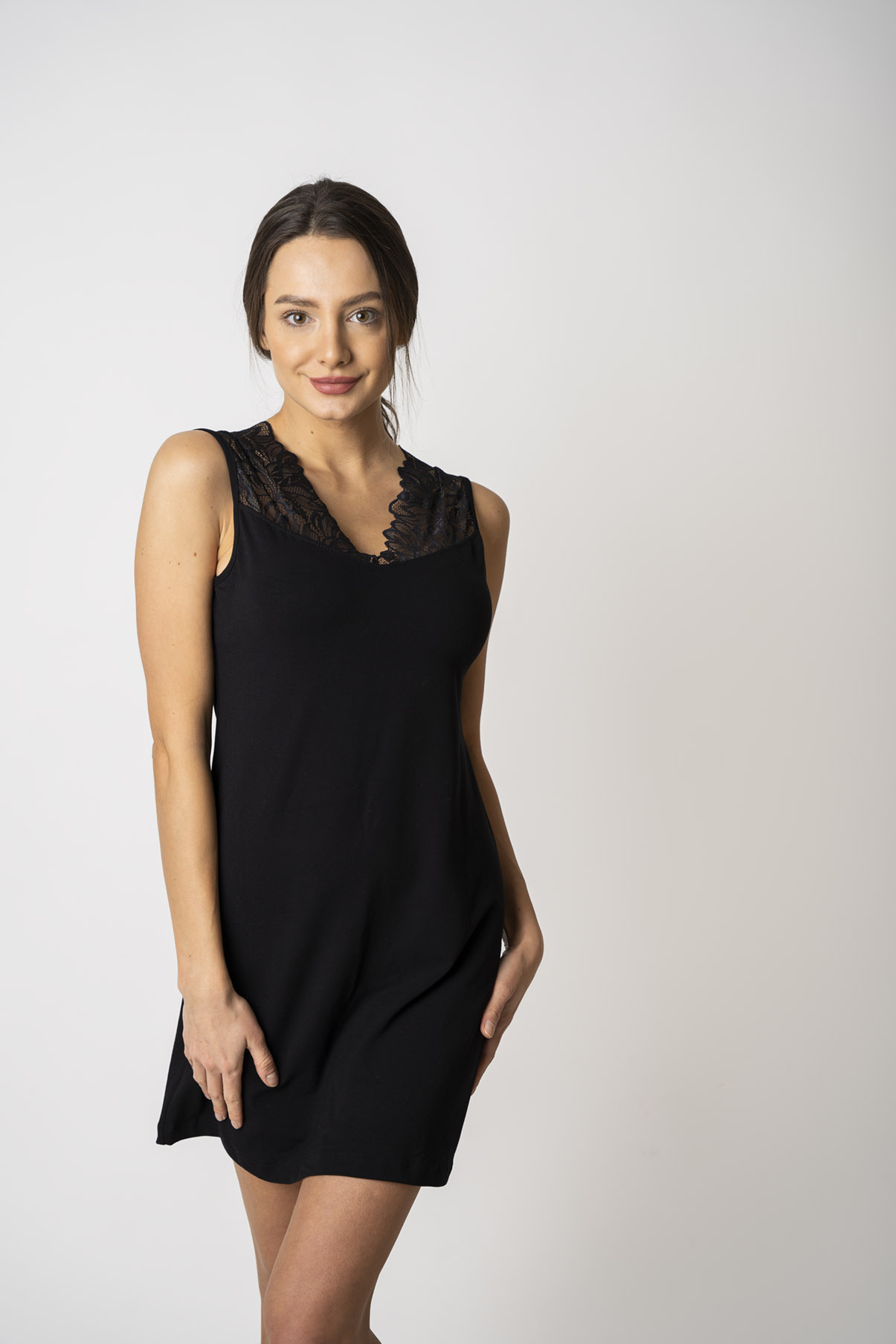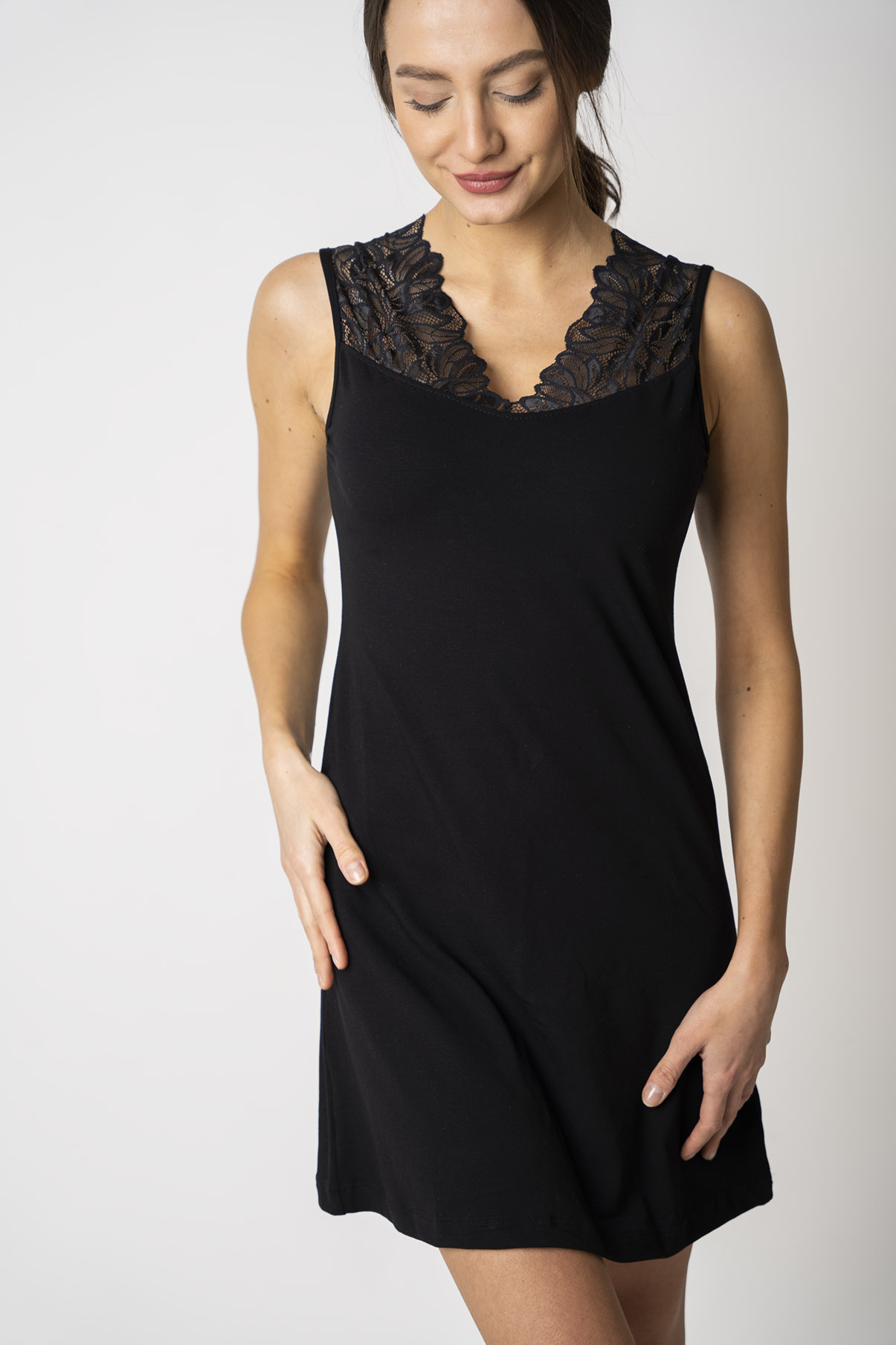Dámská noční košile s krajkou je dlouhá přibližně nad kolena (záleží na vaší výšce, doporučujeme se řídit tabulkou velikostí). Dopřejte si volnost – díky elastickému materiálu a vhodně navrženému střihu noční košile netahá, neškrtí ani netlačí. V noci se tak můžete převalovat, jak je vám pohodlné, a noční prádlo vás neomezuje.